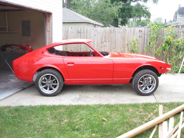 Hey guys, I shared this at CZCC, but I also frequent this site so I thought I would share here also. It has been a long road, but I have finally painted my car. Actually my friend painted the car with my help when i could. The color is true red by Mazda. It is a base/clear coat. It will need some serious color sand and polish, but I am very happy. I can finally start putting my car back together-instead of taking it apart:-D I think the color will work out well since I am blacking out all the trim. This color really blings in the sun.