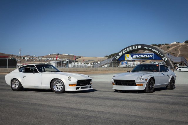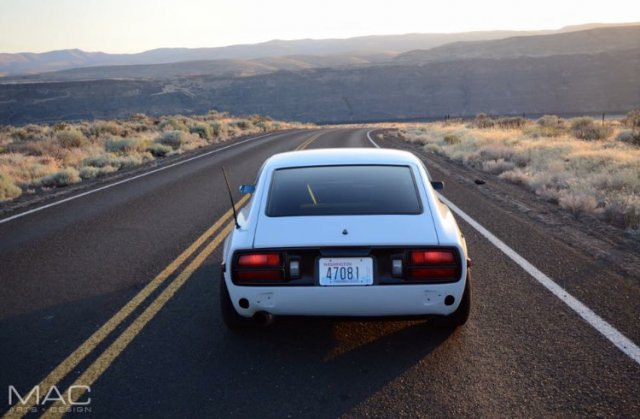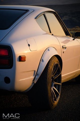 Thanks! they are 17/45/245's in the rear! Yes! There are a few in "The Official White Z Thread"! Exhaust is 2.5" from the headers into a single 3" midway down the car. Only muffler is the Kooks glass pack on the end.