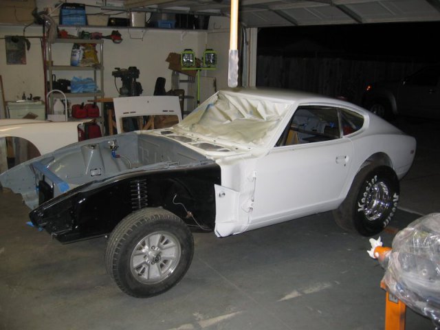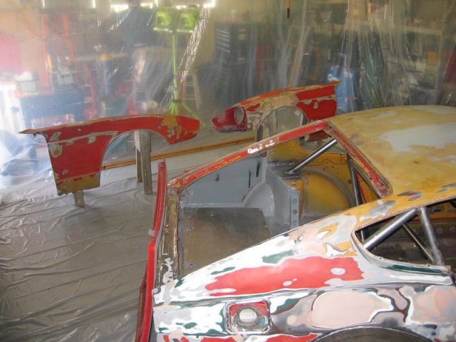 OK guys here is the latest progress on our project. Well we got the body work as good as it was going to get and put up a temporary spray booth in my garage to shoot some color on the car. Turned out OK, we were going for the 50/50 look so as long as the car is moving or your 50 feet away it looks pretty darn good! Now we can get back to the fun stuff, putting it back together and getting it running. Here are some photos I this last weekend, enjoy.