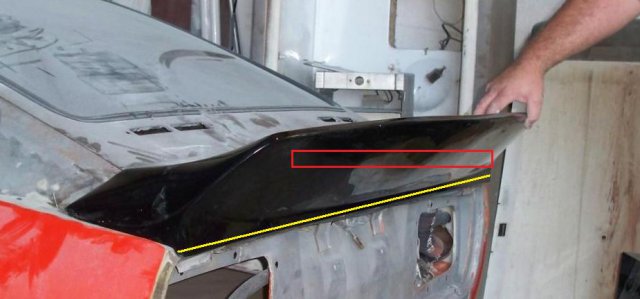 As for the commenet regarding the rear look of the tail.. "Plank". The tails rear section will be getting altered because of the mods being made. 1> ( yellow line on photo ) the lower 1/2" lip that extends down onto the edge of the hatch, that is being removed. Becasue of this, the outer edge of the lower tail will be reworked. This should eliminate some of that squired off look from that bottom side. This witht he rounded corners on top, will drasticly change things up. 2> ( red rectangle ) This whole area is being reworked because of the crapy shape *( note the waves all they way down the tail ). -