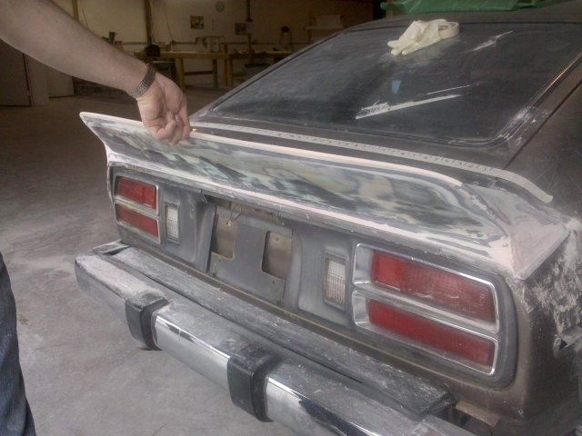 UPDATE TIME!!!.................... YAH BABY!! Tail is really starting to show the target shape changes we wanted. Note the following points when comparing the old shape to how it sits now. Outer egdes of tail are rounded Front edge to hatch is near flat ( lip removed ) Front tips/over fenders are extended out more, and now follow the curves of the car Top surface lines are smoothed out more Tail edge is thinner/sharper back edge of tail no ends at the hatch ( lip removed ) Because the back tail edge is gone, it now allows the tail to sit directly over the hatch button The over all shape is now much more fluent to the Z.. Very happy with how its taking shape. We are now working on the surfaces, making sure they are smooth and straight. I'll keep you informed as we make more progress. Brian -