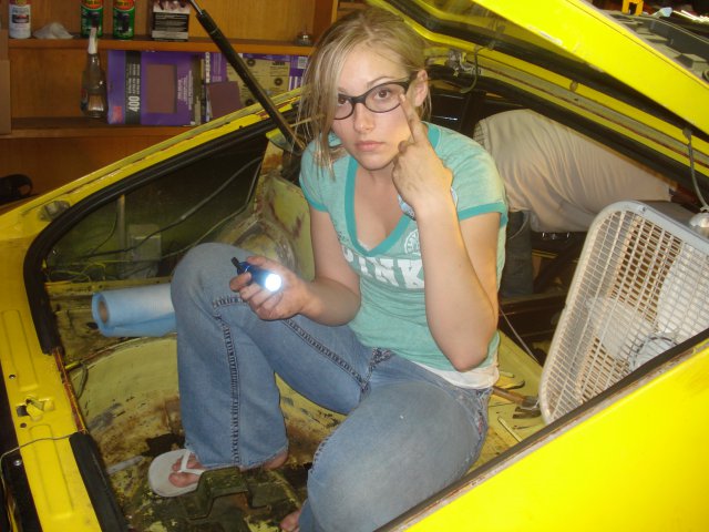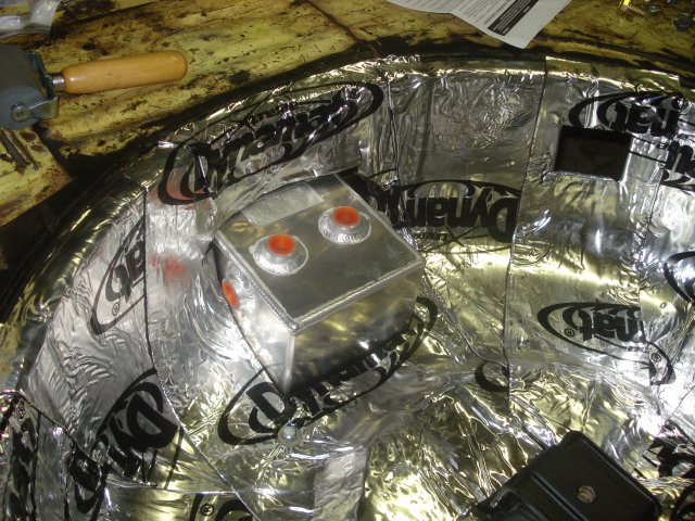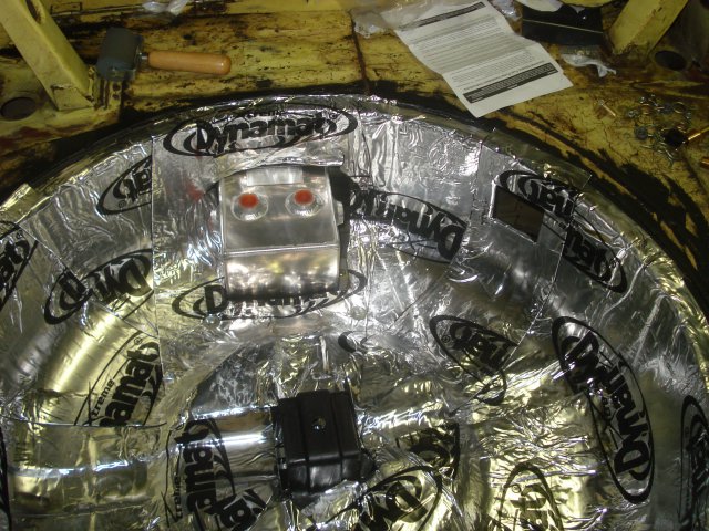 4. Fuel system. Stage 3 ( the surge tank ) Ok I have been asked a few times now about this surge tank so here is the writeup on how I mounted it and a little bit of info on the idea of a surge tank. As most of you reading know the stock 240z tank is not baffled. So what that means is under hard cornering with a low fuel level the fuel can slosh away from the feed line. That in effect leaves the the fuel system dry which can in turn have harmful effects on the motor. The idea of a surge tank is this. You have a low pressure pump coming from the motor feeding and filling the surge tank. Then there is a 2nd pump from the surge tank to the engine. The return fuel from the engine also goes to the surge tank. This means that even if the feed line temporary goes dry on hard launches or long sweeping turns the motor is still pulling fuel from the surge tank. This prevents running the fuel system dry. ( any more questions or if further explanation is needed please let me know. ) This particular writeup is on mounting the surge tank. Hooking it up will be covered in an upcoming chapter. Step one. Find a location for your surge tank. This can be quite difficult depending on how big your tank is. ( Surge tank will be appreviated ST from now on. ) I was unable to find anyone in the USA that sold STs. I bought mine off of ebay. Just search "fuel surge tank" and you should find some results. Mine is made by autobahn 88 and was sold through Zenaracing. Heres a link http://cgi.ebay.com/ebaymotors/Fuel-Surge-Tank-Aluminum-2-Litre-Swirl-Pot-System-_W0QQcmdZViewItemQQhashZitem45f16c9fb1QQitemZ300403171249QQptZMotorsQ5fCarQ5fTruckQ5fPartsQ5fAccessories. Its a 2 liter or about half a gallon. Heres a pic for all of you who look at this years from now and the link doesnt work. .. Now came the hard part. Finding a location. Ideally most people put it under the car. I tried to think of a good way to make this work but with 2 pumps a fiter and a surge tank I just couldnt find a way to make it work. Or maybe Im just lazy. This car for me is not a daily driver. I chose to cut my wheel well and put my fuel setup in it. I will put a alluminum plate over the top of the wheel well when im done with the fuel setup. Step two. This is going to depend on where you choose to mount your surge tank but for me step 2 was prepping the wheel well. First I used my trusty Pre to clean up the well and my wire wheel to get all the tough spots. I even had the help of my lovely lady friend for this part. Heres a pic. Then I rust encapsulated the wheel well. I then used my cutting wheel to notch out a square where I planned to have all my lines come through. Be carefull and mind where your fuel tank will be. I also notched out a square for my ST. Next I put dynamat thoughout the entire wheel well. ( fuel pumps are noisy.) I also used the dynamat to make sure there werent any sharp corners where my lines and ST are coming thru. http://www.abt.com/product/11695/Dynamat-10455.html . Next up mounting that dang ST. As I stated in a thread earlier I am in no way a mechanic so I cant weld and I just kind of make it up as I go. I set the St where I though it should go and started to make some alluminum brackets for it. I got the alluminum from home depot. I believe its 1.5" wide and 1/8th thick it came in an 8ft section. I bend the brackets using a wooden block and a 3lb sledge. A vice would have made life easier. Kind of just made it up as I went along. Heres what I came up with. Ok I think you get the idea. I bolted it all down and Im good to go. Oh and I also put a little piece of dynamat betweent the ST and the brackets to keep vibration down. Lets add it up. Surge tank. $100.00 Dynamat. $200.00 Optional and plenty left for the lid. Alluminum for brackets. $20.00 Mounting the ST. $320.00 Total so far. $785.00