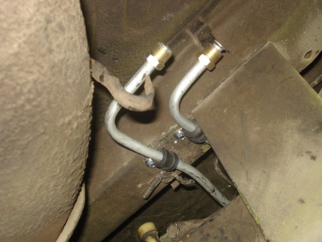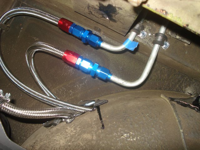 10. Fuel system. Stage 1 Well as most of you know the 240z is a carb setup. For the swap we are gonna need to change that to efi. I would like to thank rs speed and goodoldjam for all there help so far. I couldnt have designed this system without them. Step one. Drain and remove the stock gas tank per the FSM. I also removed the expansion tank. You can keep it if you want. Remove all the factory fuel lines. This should be a pain in the butt if you do it on jack stands with no creeper like I did. ( The next day I bought one.) Step two. Install the new fuel lines. I went with 3/8th hardlines. Some go with larger and others do flexible lines. I got a nice kit from Jegs that worked out pretty good. It can be found here. http://www.jegs.com/i/JEGS/555/63036K/10002/-1 As you can see it comes with 25' of 3/8 tubing. A cutter, a bender and a flaring tool. I followed where the factory lines were. I used jegs cushion clamps to secure them. They can be found here. http://www.jegs.com/i/JEGS/555/82032/10002/-1. The tubing was flexible enough to bend small bends by hand and I used the tubing bender for the rest. I did not like the 3/8npt connectors that the kit came with. They did not fit snug for me. I am using all -6an braided line for all the other connections so I did earls -6 tube nuts and sleeves on the ends. They can be found here. http://www.summitracing.com/parts/EAR-581806ERL/ and here http://www.summitracing.com/parts/EAR-581906ERL/. I then used male to male -6 fittings to make them a male connection. They are here. http://www.summitracing.com/parts/EAR-981506ERL/. I found a lot of really good info here. http://forums.hybridz.org/index.php?/topic/91311-connecting-stock-hard-lines-to-an-hoses/page__p__865552__hl__%22fuel+lines%22__fromsearch__1&do=findComment&comment=865552 Here are a few pics of the setup. Here are the hard lines through the tunnel. Here they are at the rear of the car. ( Old 3/8 fittings that have since been changed to -6) Here they are at the front of the car with the -6 fittings and adapter. Well that takes care of the hardlines. Lets add it up 3/8 tubing kit with cutter, bender, and flare. $87.00 cushion clamps. 2 packs $18.00 -6 tube nuts. 2 packs $6.00 -6 tube sleeves. 2 packs $4.00 -6 adapter fittings. qty 4 $12.00 Total for fuel hardlines $127.00 Total so far. $355.00 up next fuel tank.
