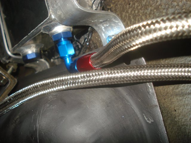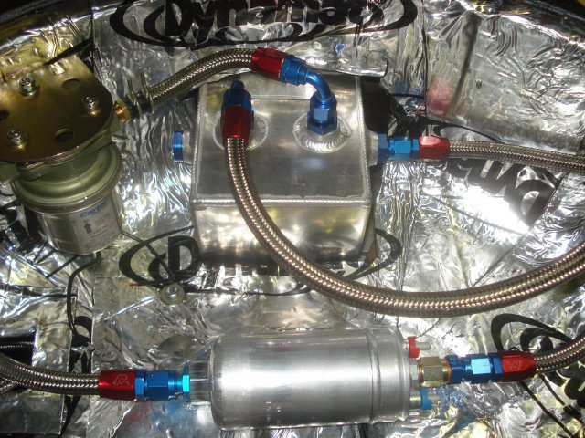 7. Bonk. I have to pumps both are external inline pumps. The 1st pump is a carter pump and it feeds an external surge tank. Its like a small extra fuel tank. The bosch pump then pulls from the surge tank to feed the fuel rails. That way no matter how low the fuel gets or if you are cornering hard enough for the fuel to pull away from the pickup in the tank you dont run the rails dry. Depending on your setup you may just want to add baffles to your tank and just run the 1 pump. Here is a pic of my surge tank. Jacob, Thanks for the compliments. The lines are pretty easy to bend and if you are carefull they wont kink. I had no kinks in mine when hand bending the lines but I did kink one when doing one of the 90 degree bends. I went to far with it