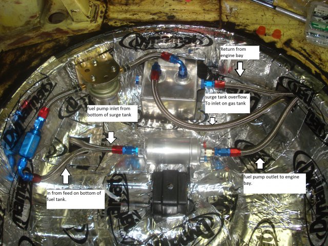 3. Pat1 thanks again for the kind words. So far its been a real pain making this surge tank work but I wont have to do it again I hope. Goodoldjam thanks again for all your help. Im glad you found this page because you have been a huge help so far. Trying to get a little more work done tonight. I spend most of my time looking at everything and laying it out in my head. Do you guys think I should mount the 1st pump down to the right of the surge tank? Is the wheel well to far away? The instuctions say to mount it close to the fuel tank and no more than 24" above the tank. I dont think its 24" above it but in the wheel well it will be more than 24" away. Let me know what you think.