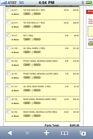 Ok I decided to not take any shortcuts on the wheel bearings. I plan to do the front lcas in a few months so I am not going to do the ball joints. I also plan on doing the ttt tension control rods when I do the lcas. So for now those are staying stock. I made a list of parts I am ordering. If you guys could look it over and make sure I dont have the wrong stuff and am not missing anything.