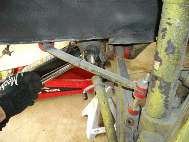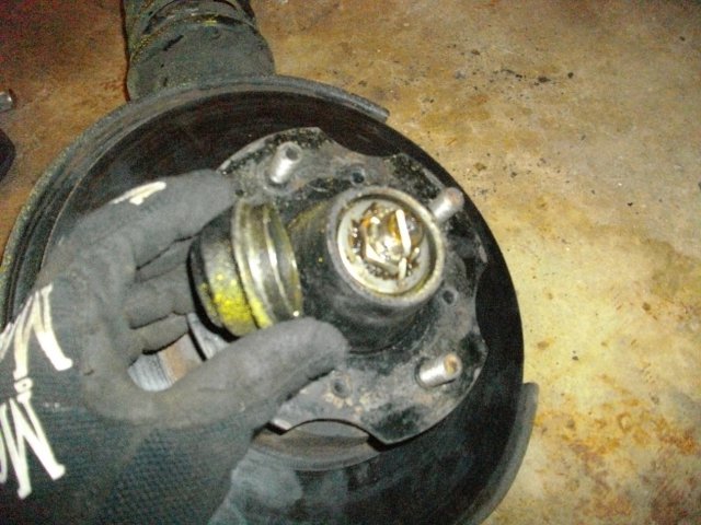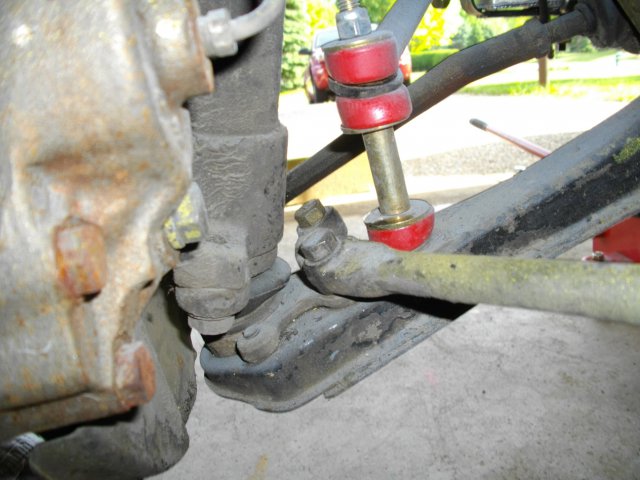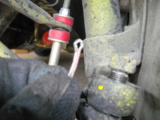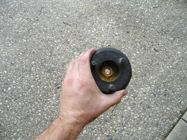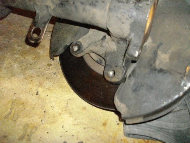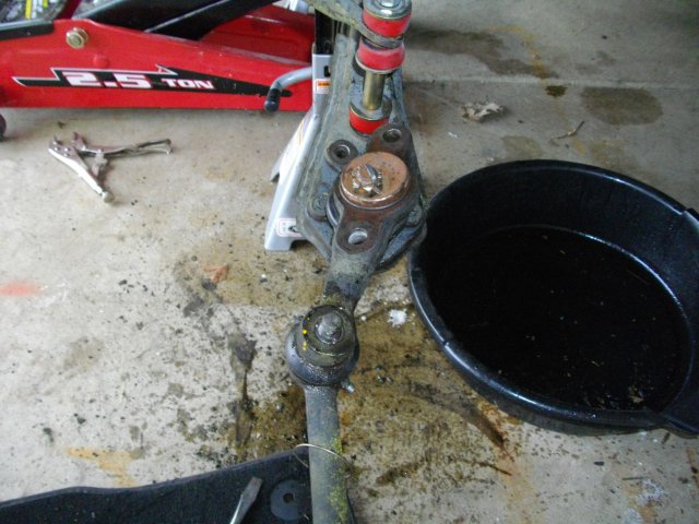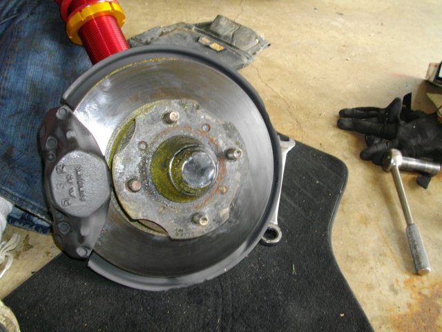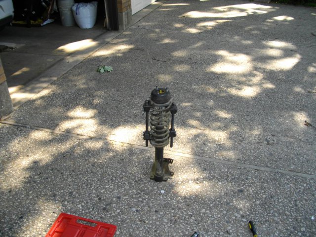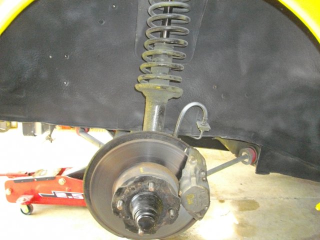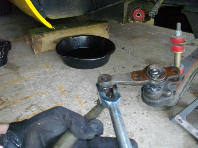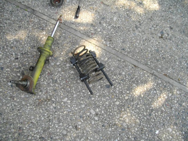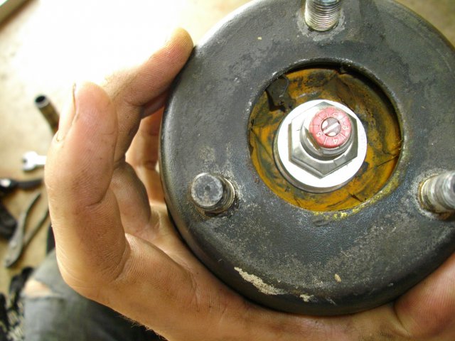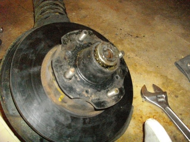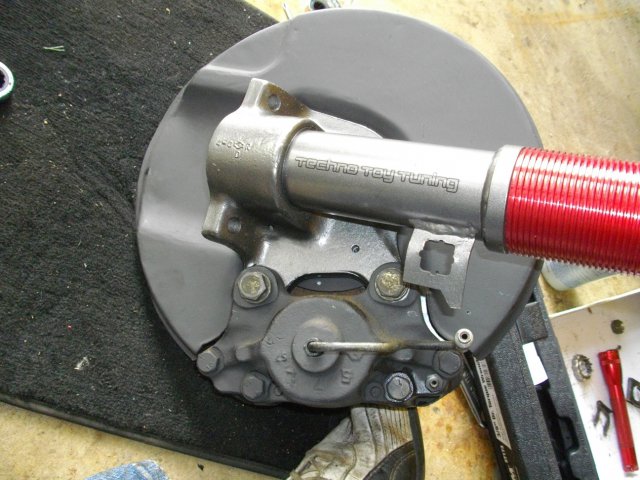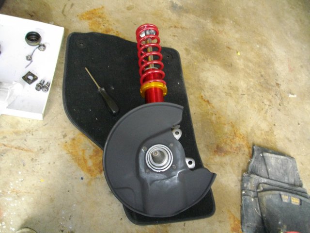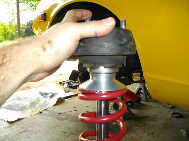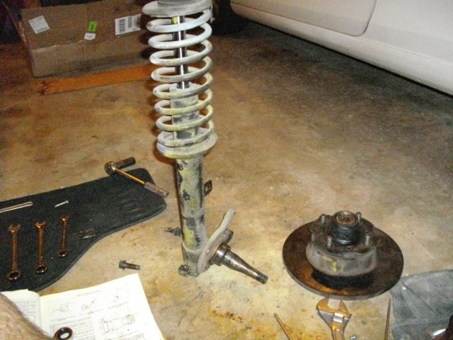 Update. Front coilover install. So I ordered a set of coilovers from ttt and have so far only received the front ones so far. Things started to move a bit quick at the end but I will try to give the best info I can. Here is what I started with. Remove the wheel and here is my stock strut. Remove the tension bar. It has bolts here. and here. Remove the cotter pin and bolt that holds on the tie end rod. Unscrew the other end of the tie rod. Disconnect the brake line. Unbolt the shock from the bottom two bolts. and the top three bolts. Remove the brake caliper by unbolting these 2 bolts. Remove the hub cap. then pull the cotter pin and unscrew the nut. Pull of the brake assembly and you are left with this. Unscrew the 4 screws that hold the brake backing plate on and you have this. Use your pickle fork to remove the tie rod. Rented mine from autozone. I also rented a spring compressor from autozone. Compress the spring and relive the pressure. Use a big screw driver to hold 2 of the bolts on the top of the rubber strut isolator. Undo the bolt on the top of the strut. You are left with this. Here is the new assembly. Reassembly is pretty straight forward. Pretty much the reverse of what we did. Start with the brake plate. I replaced all the wheel bearings. They were nasty and I wanted to freshen everything up. Here is the removal process. . Here us the new stuff going in. I greased and repacked the new bearings. This was a first for me. It consisted of taking a glob of grease putting it on my hand and then taking the bearing and repeatedly tapping it into the glob of grease until the grease came thru the bearing on the other side. Remove the old and repack the center of the hub also. Put the spindle pin washer, bolt, and cotter pin in. Tighten to 22 ft lbs of torque and then turn back 60 degrees then put the pin in. Fill the hub cap 1/4 full then put back on. Reattatch the brakes. So with this kit the rubber upper mount hole needs to be drilled out to 15mm. This hole. Took a pretty big drill and drill bit to do this. So the assembly goes on like this. Spring perch, 2 washers, strut bearing, rubber isolator, then you will need to put a few washers so that the bolt can tighten down. Here is the top that shows the washers. The rest is history. Just put it all back in the way you took it all out.