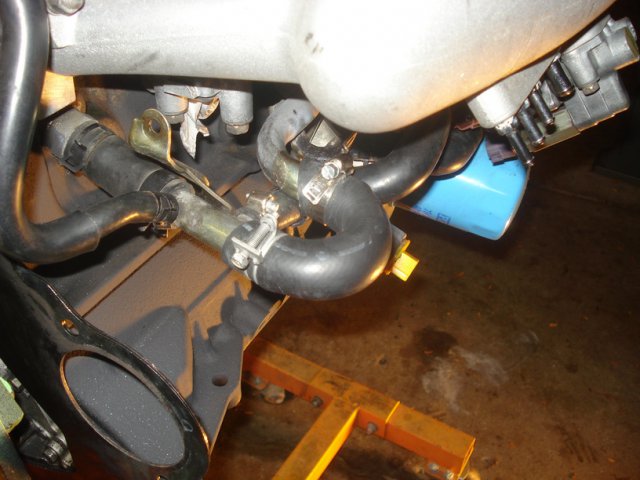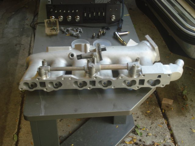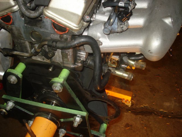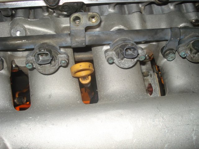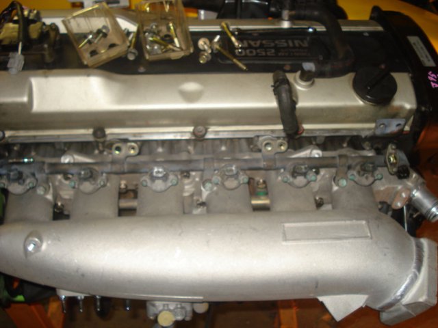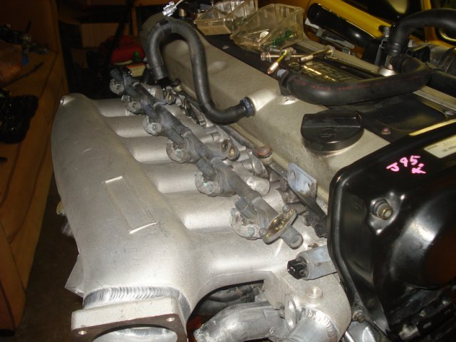 18. Update: Intake manifold Removing the stock intake is a bit tricky. Their are some bolts that you must get to from the bottom and they are a huge pain. Needless to say it was easier because I had the motor out of the car. But it is not impossible when its installed. I followed a link that I found here. http://www.skylinesaustralia.com/forums/topic/181826-how-to-greddy-style-plenum-install/ Following the step by step I removed the injector caps Then I pried the injectors out. All this was listed in the step by step in order to cut off a pipe that my fuel line didnt even have. That was a huge waste of time. first thing I did was mount the water pipe from the stock plenum onto the new manifold. have to plug this hose next to the thermostat. like so Mount the Aac to the plenum and relocated hoses like so. Test fit manifold with gasket. Mounted. Then attatch the fuel rails. mounted the fuel pressure regulator. I put it on backwards as the step by step recommended but it turned out not to be needed. pic of the dipstick relocated. removed the temp sensors from the stock intake. mounted them to the new plenum. pics of the water line connected fromt the turbo connected the 2 water pipes together on the back of the block.