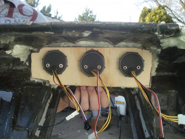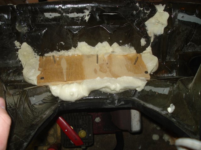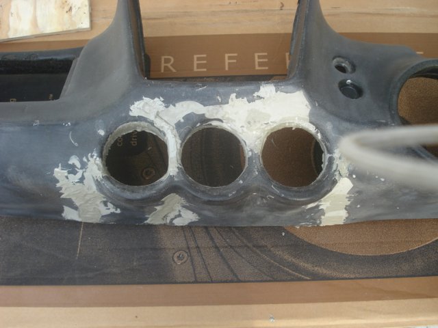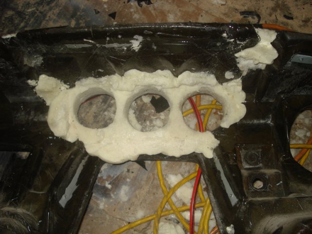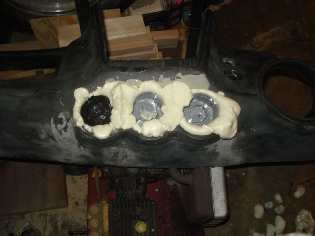 update Ok still working on the dash. Got a little work done today. Like I said in an earlier post I want a better gauge solution with a good fit and finish. This meant eliminating the cups I was using before and eliminating the gaps that I get above and below the dash when mounted at the preffered depth. Here is the beginning of my solution. 1st I screwed a board behind the gauges to give me a flat surface. Then I screwed 3 spray paint caps to the board. Then I filled all the gaps with great stuff. Here is the back. Then I began sanding them to the appropriate size. More Here is the back. I plan to mount the gauges by securing my gauge plates to the new foam. Like shown. I need to sand it all back a bit because its way to deep. Then Im gonna sand it out about 1/4 inch so the fiberglass doesnt make it too big for the gauge to fit. Let me know what you guys think. I havent heard from you guys in a while and some encouragement would help keep me motivated.