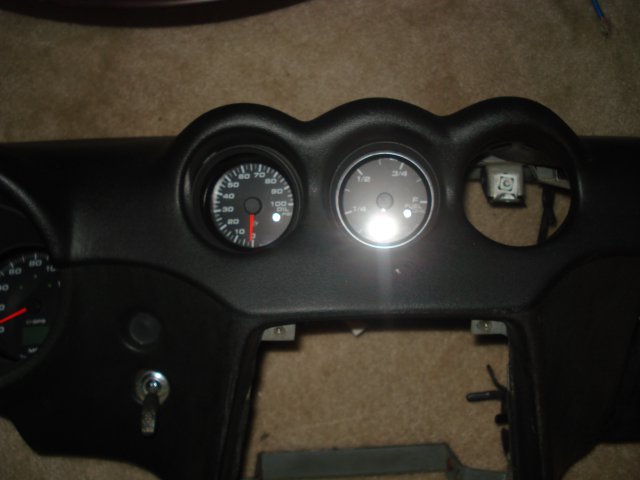 update: gauges in cups and dash So far I have gotten 2 of the cluster gauges mounted. 1st I had to make a trim ring to mount the gauge. I used some abs plastic and cut it to fit the gauge cup and to center the gauge in the plastic. Heres a pic. and another from the side. then I sandwiched that between the cup and the bezel. used the stock hardware to reinstall it. here they are from the front and also mounted the tach and speedo. As you can see my dash is ugly. I am gonna pretty this all up next year when I fix the dash. Planning on using some bondo to fill the gaps in the gauge cups and make everything fit a bit more snug. Well Im almost done with the gauges for now. I have to finish the last pod that is different from the rest. I also have to find a place to mount my voltage meter.