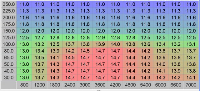 I tuned the map a little and am now showing 12.0:1 AFR at WOT and 150kPa (7psi boost). But it still acts like it's flat, and I'm willing to be that the plug tips look white. I'll try running Dave's AFR map and using his VE as a starting point, and see if I can't get those plug tips to a nice tan color. -