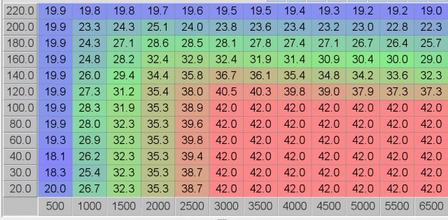 Ignore anything past 150kPa or 4500RPM - untuned areas. Plugged in raw numbers from a borrowed map. -