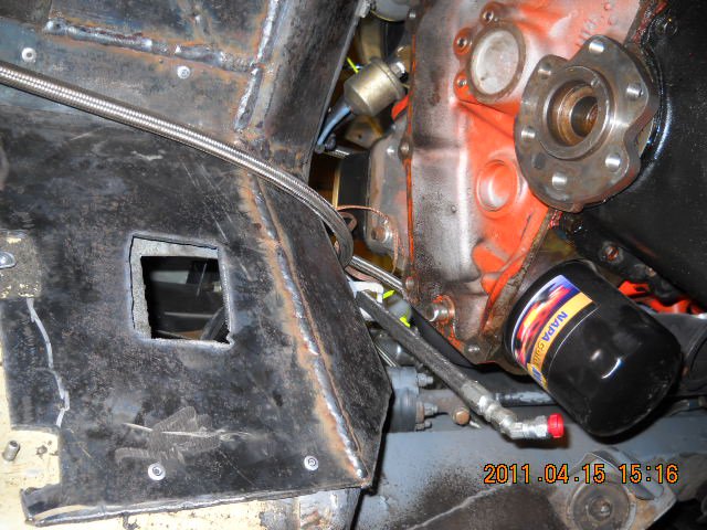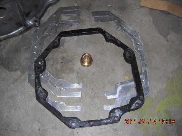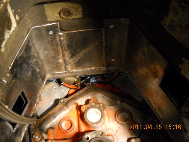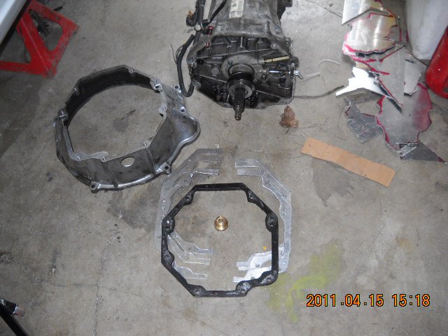 9. Sorry this is so late. i have been driving the car for a tear and have made a few changes. I have added another 3/8" of spacers and made a new pilot bushing to compensate for moving trany back. I now have a total of 1" of spacers and the pilot extends from trhe rear of the crank about 1/2". The new spacers will allow the clutch to have enough play to be self adjusting. It originally realeased at the very top of the pedal travel and had no room for wear. I also added several steel plates to the trany tunnel to act as a scatter shield. See pics . Mongo