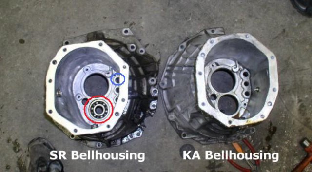 I am in the process of doing this swap.... Infact i just picked up my modified bellhousings today from the shop... The bearing and shaft holes are the ones that need fiddling with. The SR bellhousing has a larger bearing hole than the l28. HOWEVER, the inside diameter of the two different bearings are the same. Therefore, just use the SR bearing, the L28 shaft will fit on/in properly. The only other thing to contend with then is the fork hole. It is 16mm instead of 14mm, so you will need a 16mm outer diameter, 14mm inside diameter spacer to wedge in there. The other 2 holes, not circled in the picture above, do not need altering. THAT IS IT!!! One more thing.... WHY?! Seriously, the drive shaft will cost you MAX $150 to have it shortened and balanced with new cv's and the dust cover taken off and the SR gearbox is TONS stronger than the L28. My N/A L28 is punching 180rwhp, 240rwnm and i've been through 4 gearboxes in 18 months. The Z gearboxes are just getting old. The NEWEST Z gearboxes are 30years old.... Their at the end of their servicable life in my opinion. The SR gearbox is an UPGRADE, and the SR gearboxes are about half the price of an L28 gearbox.... (well in AUS anyway)... So whilst, YES, you can do it, and it wont be difficult (see above), i just dont understand why you would want to do it when it will be far easier in the long run to just make a new driveshaft and tranny mount. If you have a 240 with the tranny mount that bolts upwards, then all you do is turn the original mount around, and drill two new holes ~5mm further back on the mount, and your tranny will bolt straight in (the Z tranny mounts fit on the SR20 gearboxes). If you have a 260, where the tranny mounts are parralel with the gearbox tunnel, simply cut the centre section of the tanny mount out and re-weld it 35mm further back. Viola, tranny mount lines up. Another thing. Why not put the SR20 as far back in the engine bay as possible for weight distribution? Friend is doing this, the tranny mounts (SR20 box) are basically the same procedure as i just described, and the tail shaft just has to be shortened the correct amount. PICS. (see attachments) side by side comparison gearbox bellhousings 260Z gearbox mount modification 240Z gearbox mount modification Useful link: How to install an SR20 gearbox into a 240Z http://home.comcast.net/~zheimsothtn/transmission.htm -