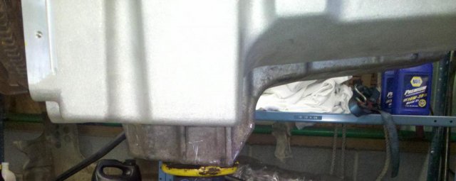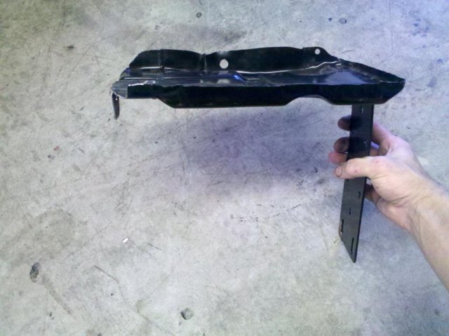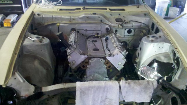 Engine: right after purchase (came complete with uncut wiring harness: After removing the harness and manifolds to clean it up: We removed the valve covers and oil pan to see how clean it was inside, it was this clean with 180,XXX miles on it! After cleaning up the outside: Once the engine was clean, we began mocking it up in the engine bay to make the engine mounts. This is the position we chose, it's low and set-back which is good for the center of gravity, shifter position, etc. Here are some of the views of the design: Driver side: Passenger side: Mounts tack-welded in place: After the mounts were welded in, I used por-15 on the undercarriage and the engine bay and we installed the engine and began the wiring: Summer 2013, Part II Pulled the engine, hopefully for the last time, to paint engine bay (a semi-gloss black epoxy): Removed cross member to modify passenger side mount, and clean up driver side, here it is before paint: Here's the custom battery tray, I had already cut the old one out because it was rusted beyond repair, this one is a reproduction for an early 70's Chrysler B-body that had good dimensions. My dad and I welded on a support bracket and shortened it, and then a bracket was added to attach it to the inner fender. The crossmember reinstalled, along with new front end parts: Changing out strut cartridges: One of the problems that I had to address was the truck oil pan, which does fit in behind the crossmember, but hung over 2" below it. So I purchased the Holley retro-fit oil pan and here is the difference in height and the installed view: Installed a 2-speed Taurus electric fan on original radiator (yes it stays cool). Installed 2010 Camaro water pump allow radiator to be highest point for air system, and discovered factory 280ZX upper hose fits perfectly (with about 2-1/2" cut off). Side view of engine with LS6 intake installed: In the next post, I will attempt to make a list of some of the parts I used to make all of this go together.