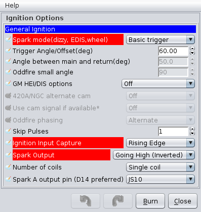 Attached are my settings for spark. I also have a VG30ET in my 280Z. I set the trigger angle to 60, and adjusted the distributor to match using a timing light. It's idling well at the moment, untuned anywhere else though. Stock timing is 10 degrees at idle. Cranking is set to 300rpm. I am using an aftermarket coil, MSD Blaster 2, and those coil specs are from MSD. I am using MS2-Extra 3.1, using the BIP373 ignitor, but I built the board a while ago and I trigger through JS10 (which is deprecated). I was wondering if you had any pictures of how you did your swap, etc. You should start one here.