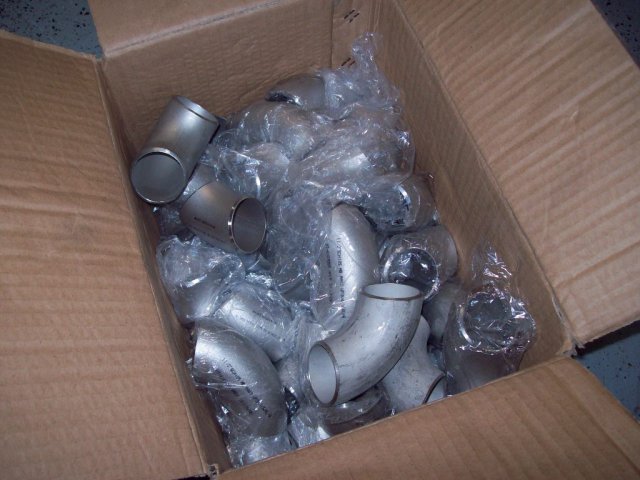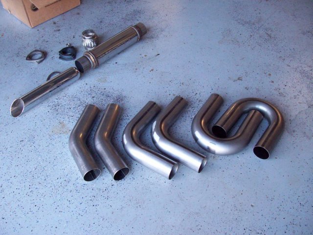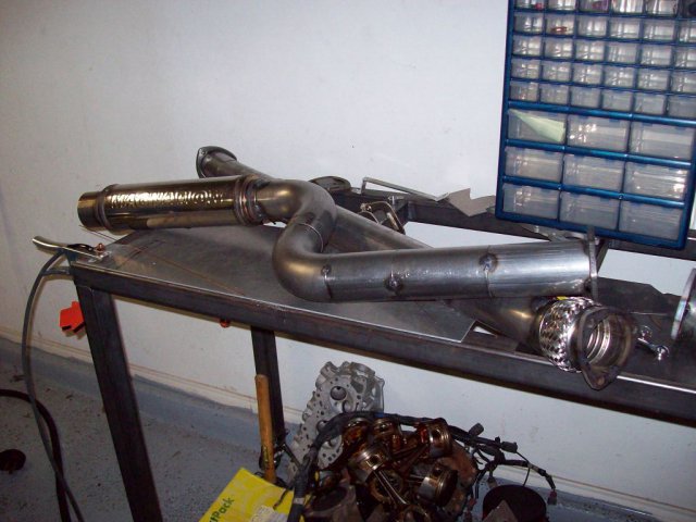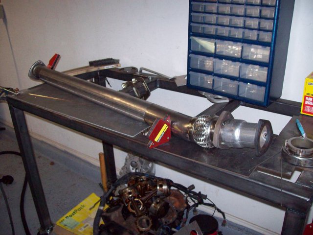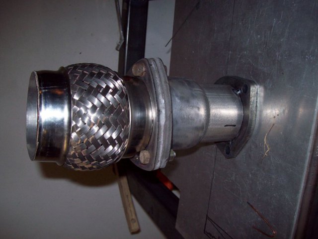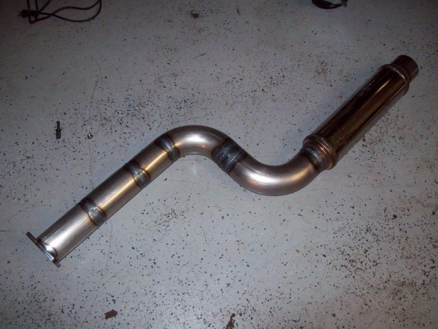 Got and installed some used 6-1 headers. Ordered a muffler and some bends and got to work on the exhaust soon after: This is to adapt the 2.5" header out to the 3" from then on. I plan on having a VG with a 3" collector later, hence the removable adapter. Flex pipe is so I can play with positioning bit later on since I'm eyeballing the entire thing. I prefer to tack the outside and then weld the inside of the flanges. Itty-bitty weld. Yes, I know I need an actual table top. They were out of the SS sheet I wanted when I made the rest of it. All complete: Turns out this exhaust is loud as hell. I hate it. Sounds "OK" at idle, but unbearable at any other speed. Really, really, resonates at high load and RPM. It sounds like one and a half civics with fart cans. So, I ordered a 24" straight through "resonator", and I will see if that helps. If I still can't stand it I'll but a chambered resonator on it.
