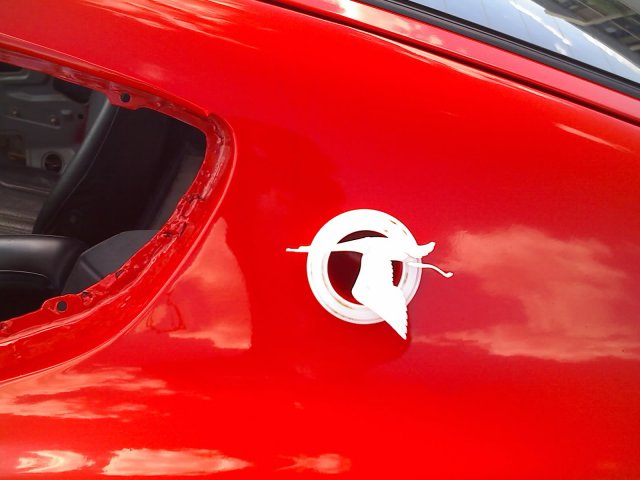 So I was fooling around on the 3D printer today and came up with this... I saw the bird in a book called "Dashboards" and it's an old logo from a 1929 Hispano-Suiza. You can't really see my plastic part very well because I took the picture with my cell phone, but it has all the same grooves as the scanned photo I've attached. I'm not sure I like it, what do you guys think? I think I might print a new one without the legs hanging out. I just wanted something different than the standard Z logo in there. If anybody has any ideas for something else I could toss in the circle, lets hear it. I'm open to other ideas!