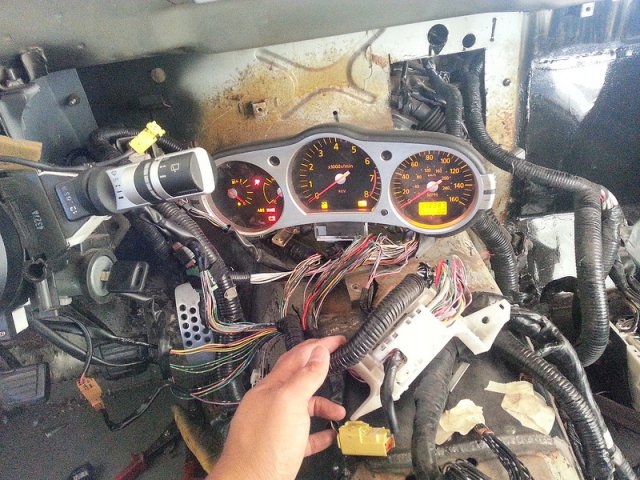 So I attempted to start up the motor and the 350z cluster wouldnt light up. There was an incomplete circuit somewhere and was not giving any power to the cluster. so i looked at the jungle of a harness that i cut up searching for ground for it and taped it to the floor pan temporarily and sure enough the cluster lit up lol....One mystery solved. Then I go off trying to turn over the engine and i hear a loud clack coming from the ecm main relay on the ipdm. I hope i didn't blow it. So I checked out my wiring and sure enough I crossed the alternator/starter source harness on to the positive lead and put power connector part of the harness on the ground.( I had my battery put in backwards) it was dark in the middle of the night. Anyhow, i ended up switching them and still no crank. So I started looking around the engine bay for issues and notice that the alternator has a grounding line that needs to be bolted to something on the chassis, and also on the drivers side of the engine it has another grounding line that needs to be ground as well, and I just realized that the transmission also needs to be ground to the chassis somewhere too. Now that I have everything grounded I realized that I forgot that the motor has no oil since the beginning of the swap. So I add oil and transmission fluid and finally gave it another try. And after a good long while I prayed, crossed my fingers, and wished with all of my might and I turn the key.....NOTHING. Nothing happened. I went through a check list of stuff. ground, spark, everything. Couldn't figure it out. Then it came to me. There is a Clutch pedal position switch that enables the motor to turn over as a safety feature. I mounted and remembered that i forgot to make a bracket for the stock 240z clutch pedal to depress it when fully down and it wasn't pressed. So I simply pressed it with my thumb while turning the key. Then I hear KA-KA-KA-KA-KA.....the motor was cranking and almost turned over. I was so happy. however it never fully turned over and so back to the drawing board. The last thing just came to mind. I forgot to put fuel in the fuel cell since i was still doing a lot of welding on the car. So I got some gas from the lawnmower in the backyard and gave it another go. After a few cranks it fired up. Finally success. But the car was unbelievably loud as hell. I just remembered that I chopped the exhaust header to clear the firewall and have not fabricated the exhaust system. no wonder there was so much smoke and heat. I turned off the car since i didn't have buy any radiator hoses yet and there was no coolant.I only ran it for like a minute. But anyhow I should be on the road soon. Thank you Hybridz and all of its awesome members that contributed to getting this project near completion. More pics to come.