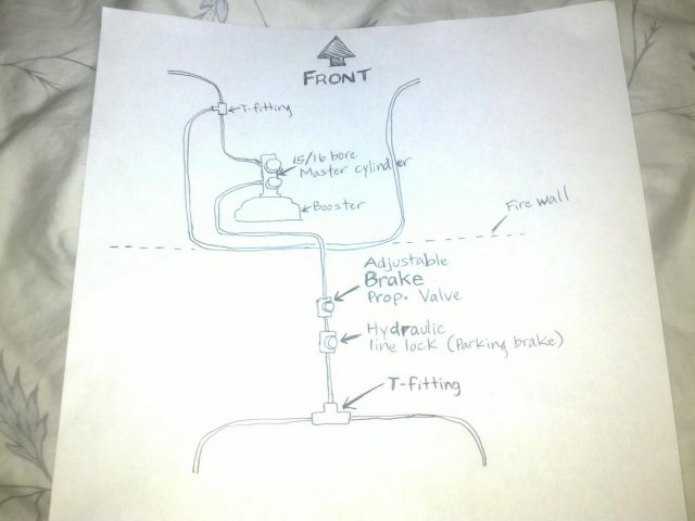 So i've been searching through dozens of threads here on hybridz and ratsun.org and can't figure out how to run my new brake lines. Here are a few details of my set up so far...My car is a 1973 240z and I'm swapping in a vq35de motor with mckinney motorsport mounts and r230 rear diff. The whole entire rear suspension is techno toy tuning's 5-lug swap set up using the z32 calipers and custom chromoly cv axles. The rear diff is mounted with techno toy tuning's r230 rear diff swap mount and I Also have the rear lower control arms and billet aluminum mustache bar as well. For the front i have Arizona Z car's 5-lug swap with wilwood calipers. I have a few of the pics in the 6 cylinder forum to better illustrate my build so far. But anyhow back to the question at hand...I bought 25ft of stainless 3/16 hardline and would like to run brand new lines. My main issue is that the rear parking brake mechanism that is used with the z32 hubs/calipers. The 1993 z32 300zx turbo parking brake mechanism that im using is a sort of inner shoe design to work by expanding and thus making contact with the inside of the rotor hat once you pull on the mechanical hand brake line. I don't want to deal with custom fab work at this point trying to make that work since it's only going to serve the parking function. I've come to the conclusion that I want a hydraulic line lock for parking instead. I know Arizona Z car sells them along with the wilwood adjustable proportioning valve and i just want to know where to plump it in the brake system. So I drew up a rough sketch of how i might set this up, but Im new to brake systems and i would like your advice on where to put everything. Please correct any problems you might notice in my diagram and educate me on where to place things appropriately.
