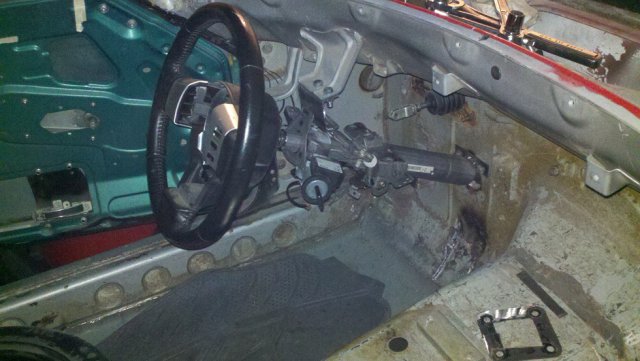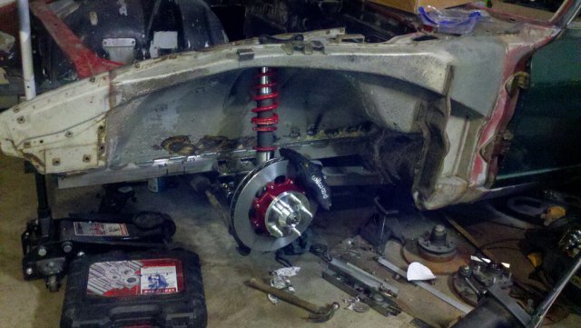 So along with my vq35de swap into my 1973 datsun 240z I decided to mount the steering column also. I didn't want to deal with reflashing the ecm and key for it to turn over the engine so i when i purchased the motor, i got the ecu, bcm, steering column w/key, ignition switch,and all the other stock electronics. Its cool also that the steering column locks to I guess it might help a little when it comes to thieves trying to still this car when its done....anyhow, here's a pic of the steering column mounted and a suspension shot of my new 5lug suspension/big brake combo i picked up from arizona z car a while back.