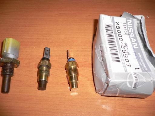 3. Nissan parts in Australia told me that the 2.4 came in the Nissan Pintara U12, the Nissan Navara Ute D21 and the Nissan Bluebird U13 in Australia I bought the sensor yesterday Nissan Part No 25080-89907, it has the number 7H stamped on it versus the RB26 one which has 9L stamped on it. The new sensor is the one on the right side (The middle one is the RB26 original) Hope I have the right one. I will check the impedance later and advise. See attached photos. The sensor on the very left is adjacent to the water temp sensor on the RB26 - does anyone know what this one is for? Is it some water temp sensor back to the ECU?