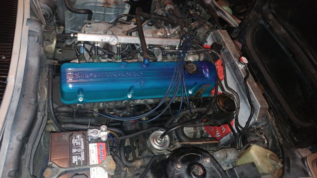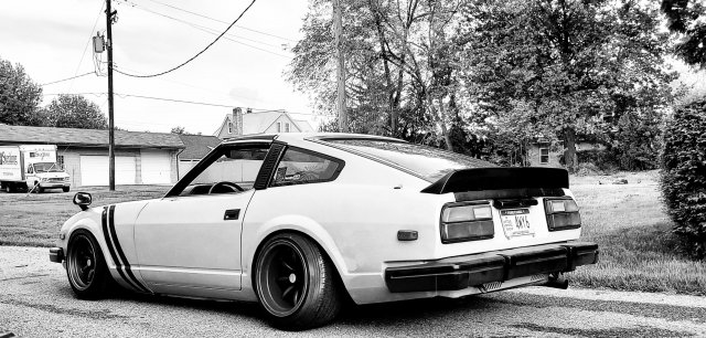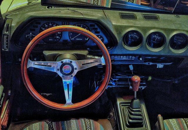 So, little update from my last post. I did get the bumpers painted and back on. I also got a 79 slick top parts car and I'll be swapping the manual window doors over to my car before the next paint job. I picked up these legit fender mirrors from DATSMO and put them on this past weekend. I also picked up this Nardi wheel and custom shift knob from Nostalgic Grains. The parts car came with some electric fans and a Palnet fuel rail, so that's on mine now. I got a bolt kit from ZSpec and installed my newly powder coated valve cover. I'll leave you with a couple cool shots I got before I put the fender mirrors on.