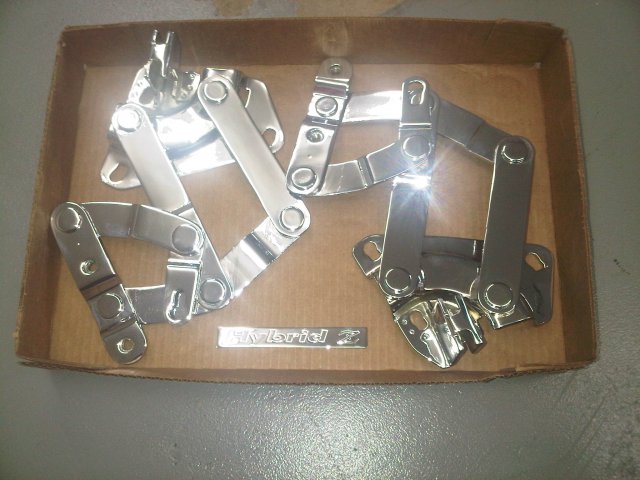 Not much progress but at least I got the hinges back from plating. Drove by restoration shop and they began stripping the body down. Ordered Magnaflow 3" X pipe and 3" polished race series mufflers with 4" tips.