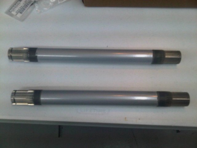 Well after some research I decided to get the M2 shortened axles. I have read about too many axles being a tight fit. I figured I have way too much money invested in the differential to take any chances. Ordered new boot kits since a friend came over to help me disassemble the axles and cut all the boots in half to take them off. Pretty cool of him especially since the boots he cut were new. Needless to say he was relieved of his helping duties immediately. Received M2 axles and send them out to be powder coated to match the rest of the drive train. Got axles back from powder coating and assembled them, this time with no help from any friends.....LOL
