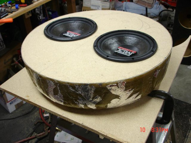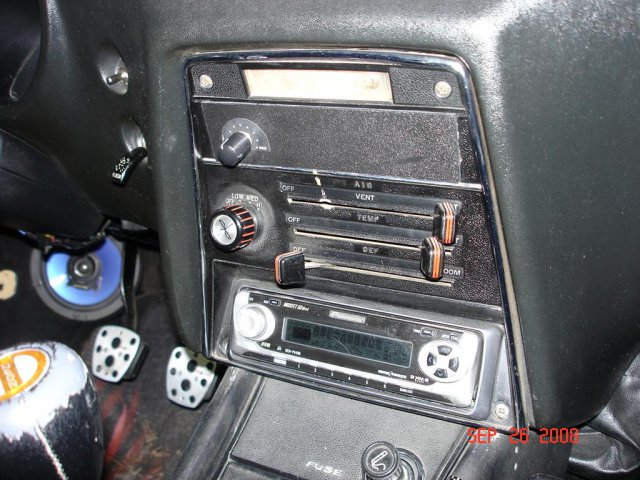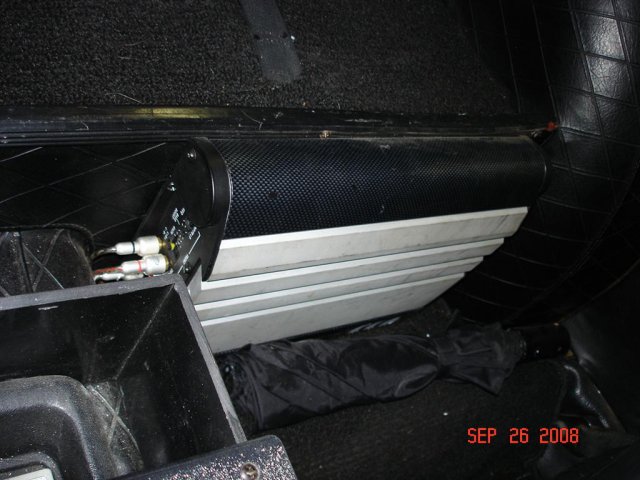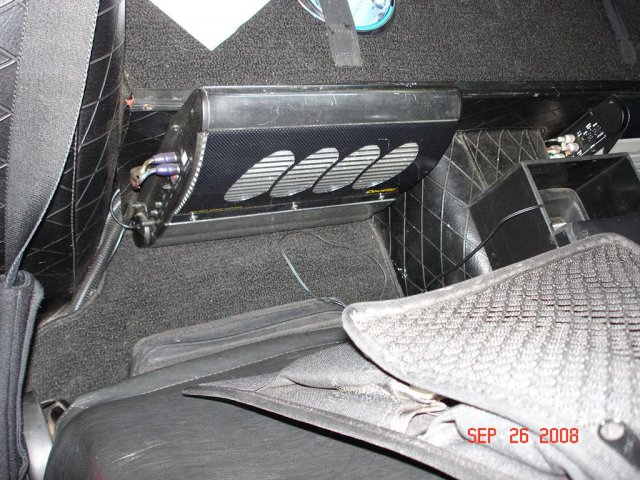 I'm pretty sure I've done this before but here ya go. P-side amp is a 400 watt 2-ch for the subs (Coustic) D-side amp is a 400 watt 4-ch Coustic for the other 6 speakers 2 subs in spare well are 10" MTX 4000 series 2) 6.5" in Kick pods are Alpine 2-ways 2) in doors are Kicker 4" 2-ways 2) in rear stock locations are Pioneer 5 1/4" 2 ways. Deck is a Pioneer AM/FM/CD/XM stereo Knob above radio (in old vent location) is sub amp control (Bass-knob) Kick pods are hand made by me Sub-enclosure is hand laid fiberglass by me 2 gauge power wire on battery to a distribution block then 4 gauge to amps