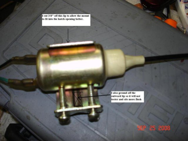 On my 240Z, I inverted the latch. ie; put it on the bottom and put the catch rod up top (on the hatch.) I don't suggest this to anyone as it's a P.I.T.A. and hard to adjuust properly. I dremmeled a hole in the license plate light assembly and it's released by putting your finger in the hole and pushing upwards. I've also included pictures of a proper time tested "Compact door lock actuator" instal and a SPAL power window instal, both in my 240Z. If you ZOOM in on the rear of the Z picture, you'll see a slight hole in the license plate light, just under the latch area of the hatch (dead center) Dave.