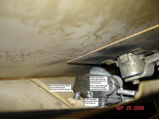 While Me and Stan have been writing back and forth about the whole Door Popper, hatch popper, electric window thing, I came up with an idea and put words and thoughts into practice. I went down to the 260Z and backed it into the garage. Popped the hatch and started tearing the assemblies apart. I removed the lock, the latch assm and started thinking. I do this stuff for a living and putting enough torque in a downward motion would have to come from an enlarging cam or a downward pull. So I bent a 3/32" rod with a 45* bend and it basically looks similar to this.... _/_ but with a 45 instead of the 120? degrre bend shown. after the bend, it'll be about 1 inch long (1/8" then 3/8" then 3/8" then 1/8" I used an 11 LB cable pull hatch/trunk popper. If you look in the hole of the hatch that the latch came out of, you'll see a metal lip (about 1/8" tall) to the right of the opening. Grind that lip down so that the cable of the 11 or 15 lb actuator can slide in that area. Weld the bent rod parrellel to that ground area as shown. Then drill a hole in the push tab of the latch as shown. (hardened steel but a good bit will do it) I also used a dremmel with a thin cutting disc to make the opening for the cable to slide thru and into place. I also drilled a cone shape into the tab for the cable to sit in. On the cable, I put it in the Vice and left 1/4" up and exposed. I used my mig welder and just tapped the top of the cable to get my feed to ball up, then I tapped it again to get that weld ball to attach to the cable. I repeated this until I was happy with the end result. (a steel ball on the end of the cable.) I then slipped the cable thru the bend of the welded rod and out thru the latch hole, so I could slide the cable thru the cut on the tab and into the hole. Keeping a slight tension on the cable, I slid the Latch into its hole and bolted it down. I then used a screwdriver to "Latch" the lock of the latch? This puts the tab of the lock in an upward position. Then I slid the cable Popper into the Hatch near the underside of the emblems. Marked the holes of the Actuators clamp, and bolted the actuator mount down. I then slid the actuator into the clamp and gave the cable just a little tension. Then I moved the actuator forward to give the cable a little Slack (to give the actuator a running start and this gives the cable a "tug" so to speak) Then tightened it down into the clamp. I wired it up and tested it with ONLY A 9 VOLT battery and it worked like a charm. So as you can guess, it kicked arss with 12 volts. This set-up, with the cable being mounted as shown, on the tab of the latch, also allows for flawless use of the stock Hatch lock button. There is NO interferance what-so-ever. But you can still "Shave" the lock if you want. Hope this helps some and does'nt confuse too many. It took a few hours to complete but that was because it was all Xperimental at the time. Run the wires thru the frame of the hatch, over towards either defrost cable and drill a hole to pull the wires out and connect it to a fused switch or keyless entry system. Dave. I'll post a video on you tube of the "POP" and link it
