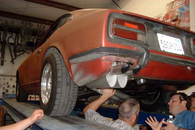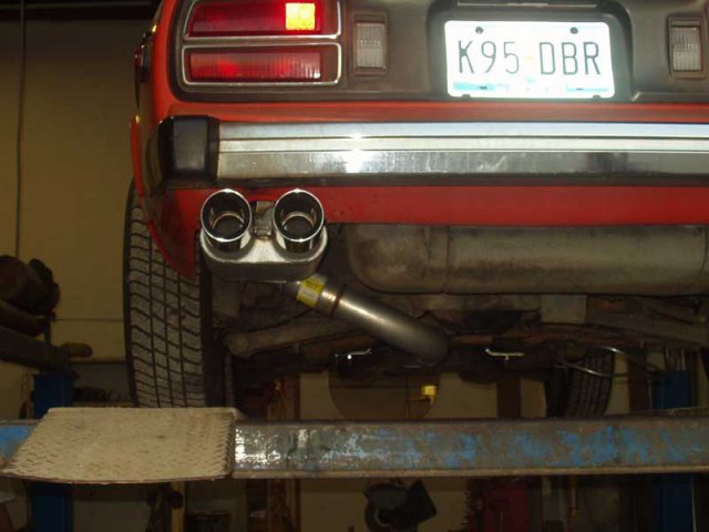 David, I did some measuring - On my 280z (which has a stock indentation for a resonator in the tranny tunnel) it will fit up high enough that it will not create any clearance issues (hopefully). I think the 240Z has less clearance in that spot. I will crawl under my 240Z later in the week to verify... those pics that I posted appear to all be 240's - I'm liking the idea of the x-pipe muffler since it accomplishes the same as a regular x-pipe but also will quiet things down. Now that I have that part settled i'm trying to figure out what to do with the rear muffler - basically a few choices - 1. buy a single muffler will dual inlets and a single 3" outlet and run both pipes to it 2. try to fit 2 mufflers in the stock location as previously discussed (still working on those possibilities but fitment will be tough) - may have to modify the spare tire well to pull it off 3. Another possibility which I haven't put much thought into is to run a dual in/out and lay it flat in the stock location like this: Some other pics to check out downloaded from who knows where pertaining to number 2: