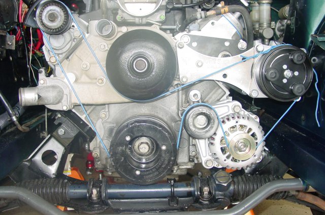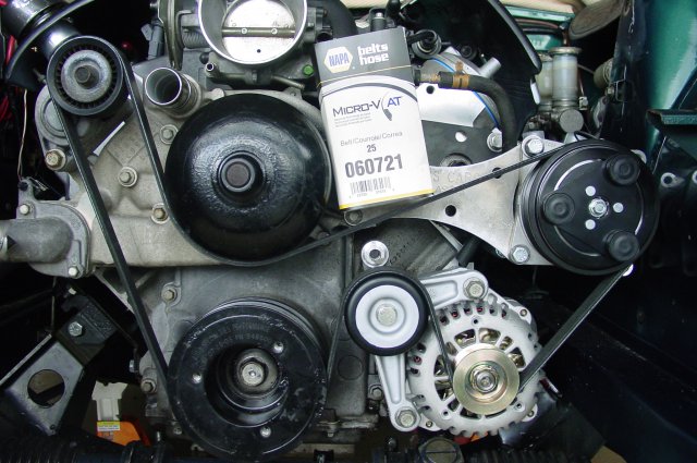 Well - Yours will differ from mine because I have an under drive crank pulley, but it was very simple to get the belt required. Just have a friend hold the tensioner all the way in and have a wire ready that you can route as if it were the belt. Twist the wire together while the wire is very tight in place, then let 1/4 of the tension off the tensioner which will stretch your twist knot, then make a mark on the wire with a sharpie, then take the wire off, untwist it and measure the distance between your 2 marks - that's the size belt you need - then go to Napa tell them the length and you have your belt - if your belt size falls between 2 increments buy the larger on of the two... The belt I used was NAPA code 060721 but don't forget I have an under drive pulley and I think the next larger size would be better because mine is kinda tight Here's a few pics that may help you: