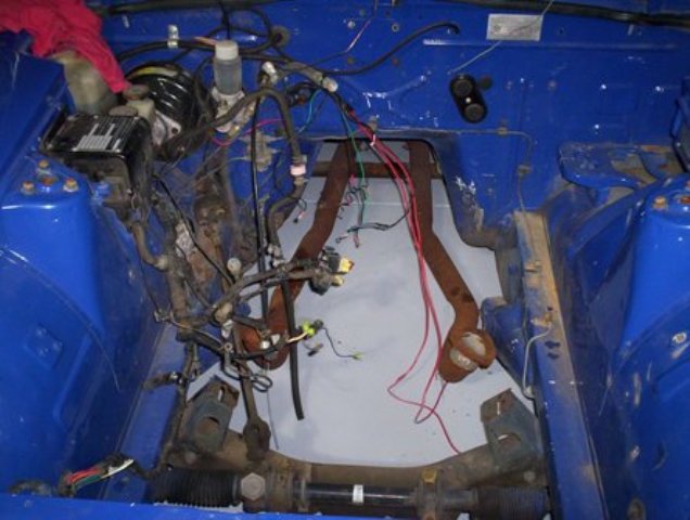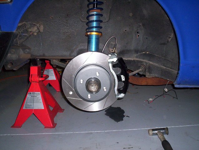 In the first pic i am about to tackle the rewiring. The voltage regulator and ballist resistor will be removed with other unwanted bits and pieces. Second pic the engine is in, notice the lack of wires now and also the 1" master cylinder for the brake upgrade. Third pic, 300 mm vented slotted rotors with pbr claipers. Fourth pic, a trial fit with the Simmonds for clearance.