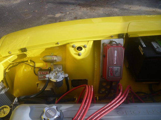 13. some pictures of the engine bay completed Shows the MSD6AL and Tach Adapter along with the Filter King regulator / filter. I really like how the MSD bracket turned out. Shows 42DCOE-8 set-up and linkage. The return spring is simple and effective. You can see the copper gasket in this picture. Seems to be working fine so far. Opposite view of engine bay. Still needs a few minor items and pieces to complete, but at least it's running. Currently in the break-in period.