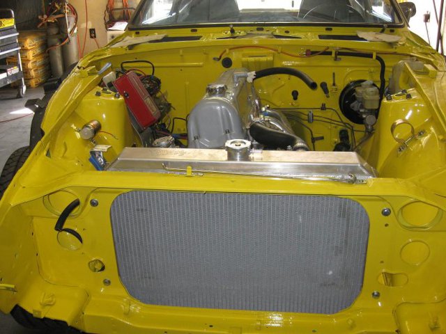 I got the 240Z radiator from Wizard Cooling (there was a link earlier). When I got the product a few years back there weren't that many alternatives *like the sub $200 ones on eBay*. The quality of the radiator from Wizard is good and unlike generic radiators, the tubes to connect up to my OEM radiator hoses were spot on. Also, it didn't hang low like a 280Z radiator. They'll also make a custom fan shroud for a reasonable price. Here's the radiator installed on my 240Z We've had no cooling issues, but it hasn't been all that warm since we've been testing the car.