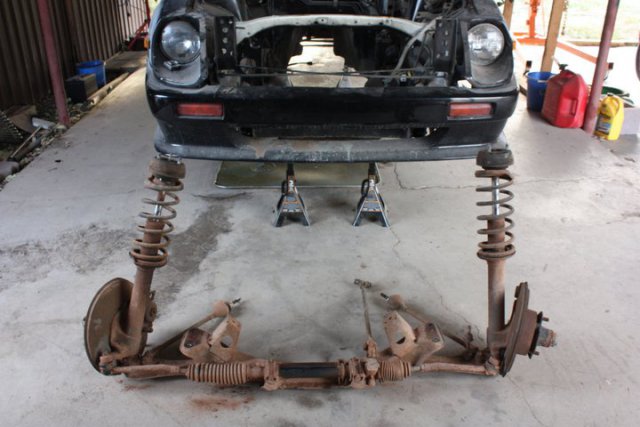 The loan covered engine purchase, oil pan, greddy style intake, and engine mount kit from mckinney motor sports. Now to switch gears a bit, with limited adjustable suspension choices for the S130 as well as brakes to handle stopping the RB, I decided to do something different and swap subframes from a S30 chassis. Surprisingly there isnt much difference between the subframe areas of the S130 and the S30, after a visit to the junk yard I had the subframes from a 240Z. Here is a picture of the front.