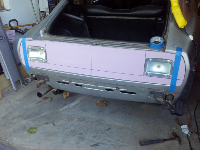 I then used 1/2" foam insulation sheet and laid out the tail light surrounds and license plate holder on the sheet in their mounted positions tracing the general shape into the foam. I cut out the template and shaped it to fit into the rear end: