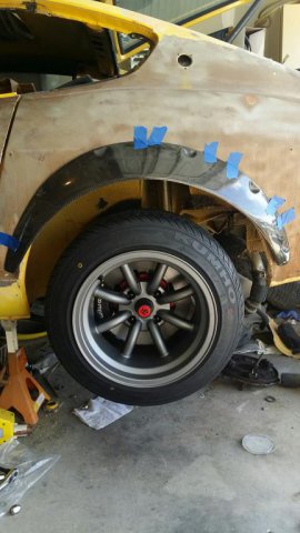 I'm running WORK wheels in a 17x10.5 -34 upfront and 17x11.5 -44 in the rear. I know they're not the spoke wheels you'd like but that's how my set up is with wide ZG flares. -