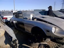 23. Just kidding, I'm sure someone just took the roof for sectioning. This is my local junk yard and I had pilfered parts from this Z before. When i first found it a few months ago the car was full of dynomat, had a rebuilt airbox and was totally redone inside and out, I'm not sure why it was in the yard at all. I stripped what I needed and when I ran across it again this last weekend I was shocked to see the dash was missing (it was beat up pretty bad) and the roof was removed. Just thought i would share