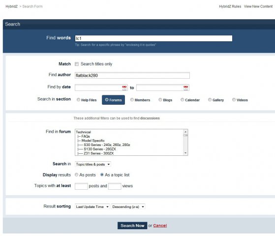 flatblack280z, do me a favor and try searching again. Just to be sure you and I are doing the same thing, click the gear on the upper right corner next to the search box. Then use "LC1" (without quotes) in the find words field, and your name in the author field. Then make sure to click the forums button (mine continually defaults to help) AND make sure none of the forums are selected in the box below. Screenshot attached. When I do that, I find 2 threads of yours with LC1 in them.