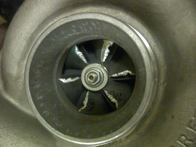 I was pulling the turbo to install plate locks on the manifold nuts and noticed this damage to the compressor wheel. I've never run the car without an air filter attached so am really surprised to see this. It looks like something hard was rubbing against the blades. There is also more lateral play than there used to be - enough that the side of the blades can just begin to touch the housing, although the wheel still spins freely. I've looked inside the tube and cannot find anything at all. Any suggestions for what caused this? Also, looking for suggestions on where to source a new wheel? Rebuild kit?
