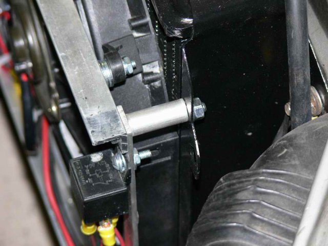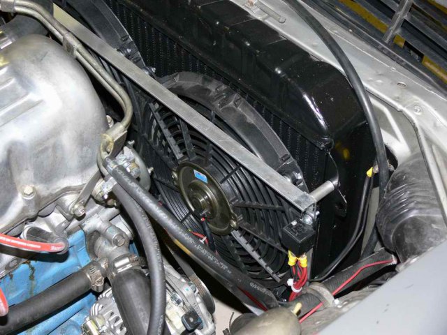 That's the same fan I am using, just from a different seller. You can control both fans from a single controller. You wire them in parallel which means the red wires from both fans are connected together and then to the relay, and the black wires are also connected together and then to ground. Before I switched to megasquirt which can control the fan by itself, I used a Hayden 3651 controller which includes a sensor that mounts in the thermostat housing and allows you set the temperature at which the fan turns on. I prefer that to a sensor that mounts in the radiator fins as that's not as mechanically secure. I still have the Hayden controller - PM me if you're interested. I'd be careful about using the plastic ties that come with the fans. They place the weight of the fans onto the fins and tubes of the radiator which aren't designed to carry a load. I did that when I first mounted mine and 6 months later I had 2 leaks. This is on an MSA 4 row rad that is now about 3 years old. 2 of the ties had come loose which probably contributed. I just had it fixed and changed the mounting arrangement as you can see in these pictures. I used this approach earlier with good success. The load is carried by the aluminum angle bars and the fans are held snug against the radiator. The spacers were cut from some aluminum tube I found at home depot.