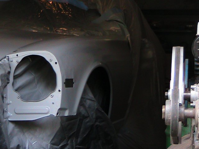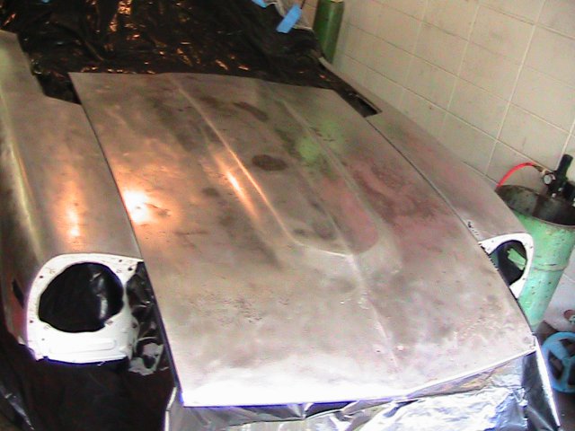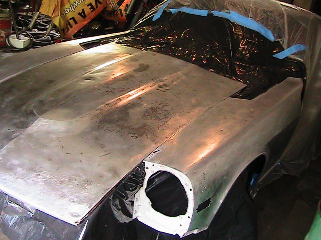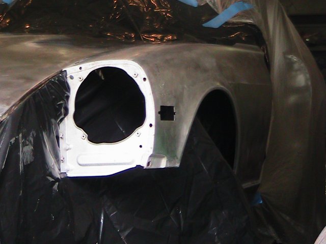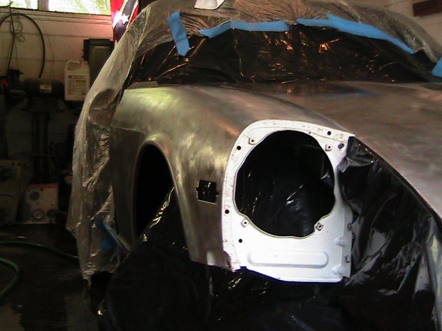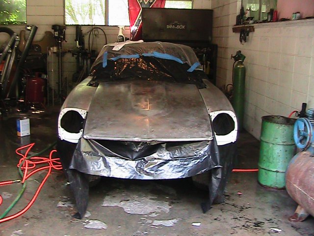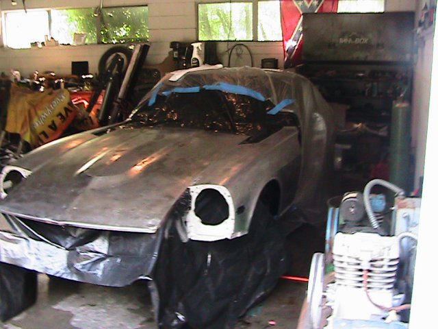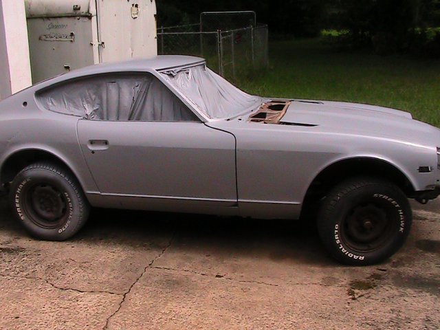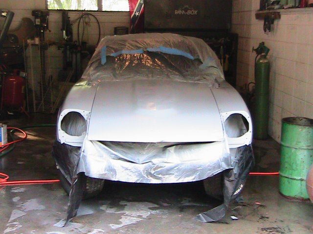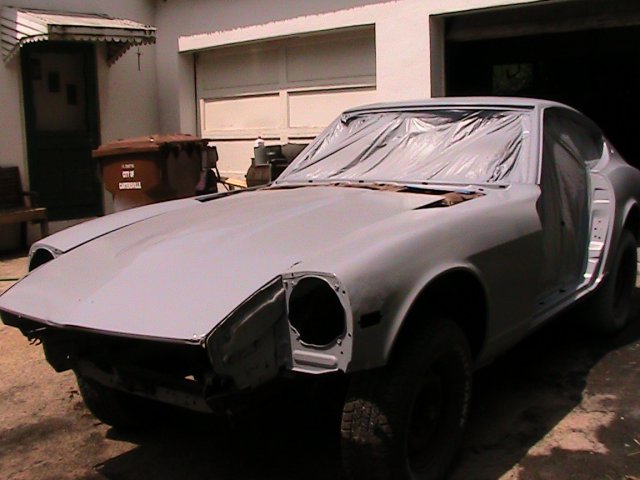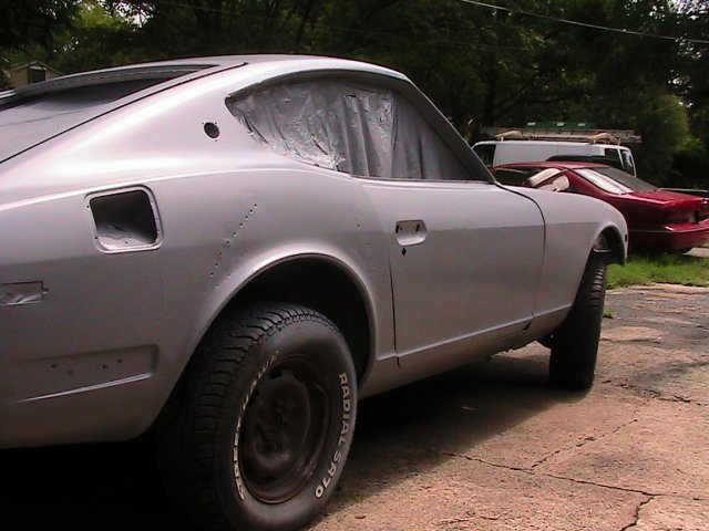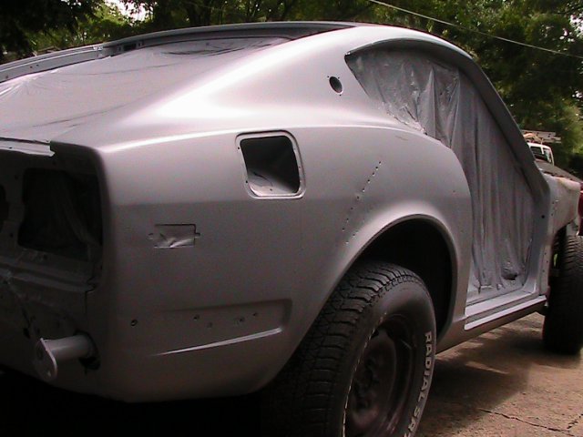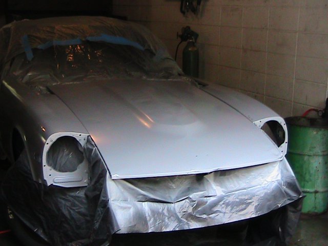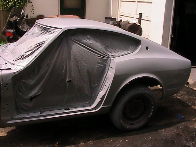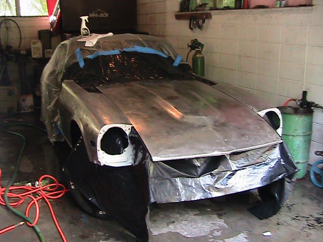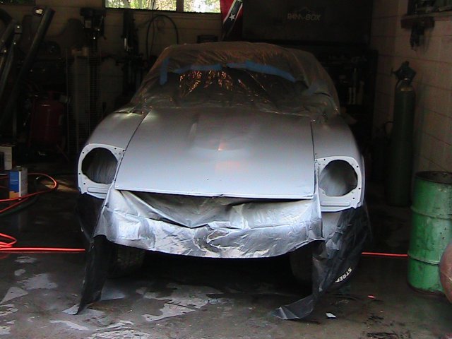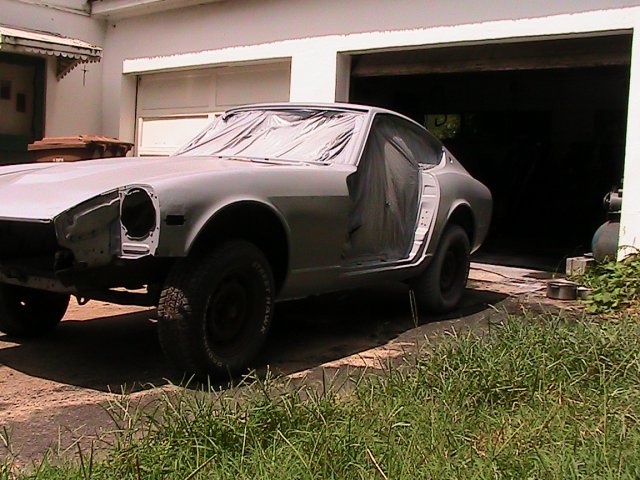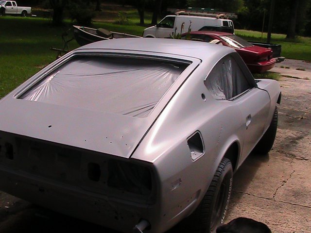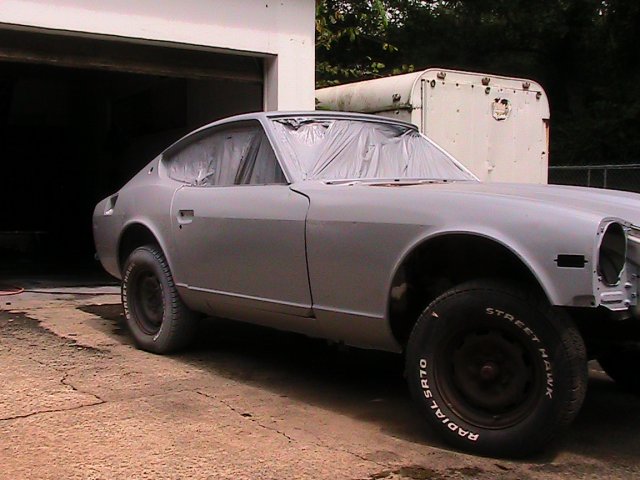 17. after more DA'n (i didnt paint it the other night and some flash rust started to take hold again) I finally got the rest of the exterior of the body in primer. Im not gonna upload a whole bunch of pics cause this page already takes forever to load an resize the current ones. Anyways, progress on the car is gonna take a back burner as school just started back and I've got to buckle down on that crap now. Good thing is I ordered a mustache bar from arizona z car for the q-45 as well as the front mount from techno toy tuning. Im looking for a 280z parts car to pull the stronger stubs and companion flanges out of before I ship those off to russ from Modern motorsport to get his axles and conversion flanges to round out my q-45 install. O yea and the rest of the exterior will also be blasted as well as the interior and undercarriage sometime in the near future. HOWEVER, im taking back my harbour freight 40lb pressure pot blaster and putting the 100 bucks towards something that will work a little better. I plan on renting a 50cfm tow-behind deisel powered air compressor as well as a 100 or 300lb pressure pot blaster from a tool rental place for about 200 bucks a day. I think it will be well worth the money over blasting for 10 mins and waiting on my compressor to catch up to continue...and the HF pot blaster gets clogged alot, has already blown of the hose due to the crappy hose clamps supplied with it as well as busted the air/water filter only after 2 uses. I just think my money would be better spent on something more powerful...even if it is only to rent it. So far ive used about 300lbs of media and only got the engine compartment, jambs, and windshield seal areas. Im thinking about another 500-600lbs will finish the car...i guess we'll find out soon enough. Enough talk...enjoy the pics