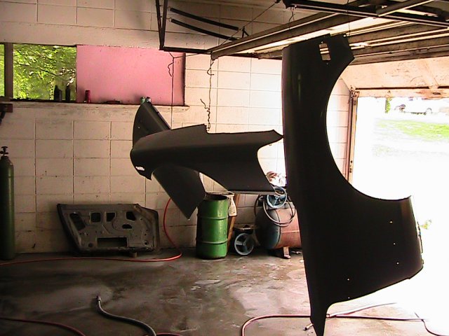 24. I snapped some more pics just after hitting it one last time with the orbital sander and cleaning with acetone. these pics are in the garage with crappy lighting so hopefully ill have some better ones up tomorrow sometime with it out in the sun. Today I got both front fenders, the hood and hatch in primer. All in all it turned out ok...got some crap that was floating around in the air to settle down on the paint before it dried even after cleaning the dust outta the garage and keeping wet floors the entire time so thats kinda a bummer but its not the end of the world.