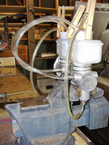 See picture for bench bleeding set up. I open up both bleed nipples and then push the piston in slowly until all of the bubbles are gone. When you remove the fittings in the outlets fluid will leak out so I plug the outlets with small rubber stoppers. Remove the rubber stoppers just as you are hooking up the hard lines to the MC to minimize fluid loss. Also, I hook up the hard lines before I bolt the MC to the booster. Makes it easier to line up the hard line with the MC outlets. The fittings in the outlets are old brake lines. Be sure when you attach the fittings to the MC that they are tight or air will be sucked in as you push and release the piston. Do not clamp the barrel (cylinder) of the MC in the vise as you could deform the cylinder causing it to leak. -