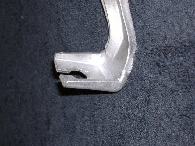 I just installed a MM 240sx brake kit on my 240Z. There are two issues 1. Driver's Side Flex Line: I installed the 20" hard line that goes from the T block on the passenger side to the driver's side and used the SS flex line that came with the MM kit. The geometry and length of the flex line makes it fit very close to the frame and will most likely cause it to rub on the frame. I am thinking about getting another flex line the same length as the passenger side that Ross supplied in his kit. A longer line should allow it to droop below the frame, but not so long as to hit the half-shaft. From my search of the archives I see others have had this same problem and have just installed a flex line all the way to the T block. 2. E-Brake Arm on the 240SX Caliper: I bought 1994 remanufactured 240zx calipers. The problem is that the e-brake actuator lever that connects to the E-brake cable is completly different than the pictures I have seen here. On mine the lever has just a hook at the end. It looks like the letter "J". there is no way it will capture the fork on the end of the E-brake cable. I do have an old set of calipers I bought for core charge. See attached pictures. The new caliper is black. Miles