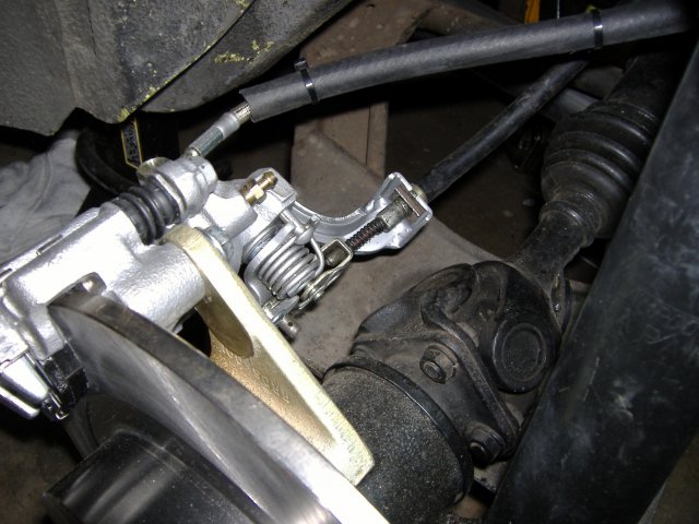 Here are some pictures of the modified E-Brake bracket installed. The cable fits perfect. Pulling the E-Brake handle up locks up both calipers. -