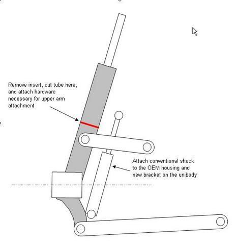 Not trying to discourage anyone from doing a double A arm conversion, provided they aware of the challenges involved. Really to do it properly the car would need to be put on an alignment frame so the new mounting points can be located accurately so its not really your average DIY project. There have been previous discussions on this same topic with pics and measurements of various possible donor parts. It would also be possible to make up a front end from parts available from those stockcar race places. Anyway, here is a sketch of a double A arm conversion of a stock rear strut I took from this forum years ago. Sorry don't know who the original poster was, perhaps something similar could be done for the front. From memory someone actually did this conversion.